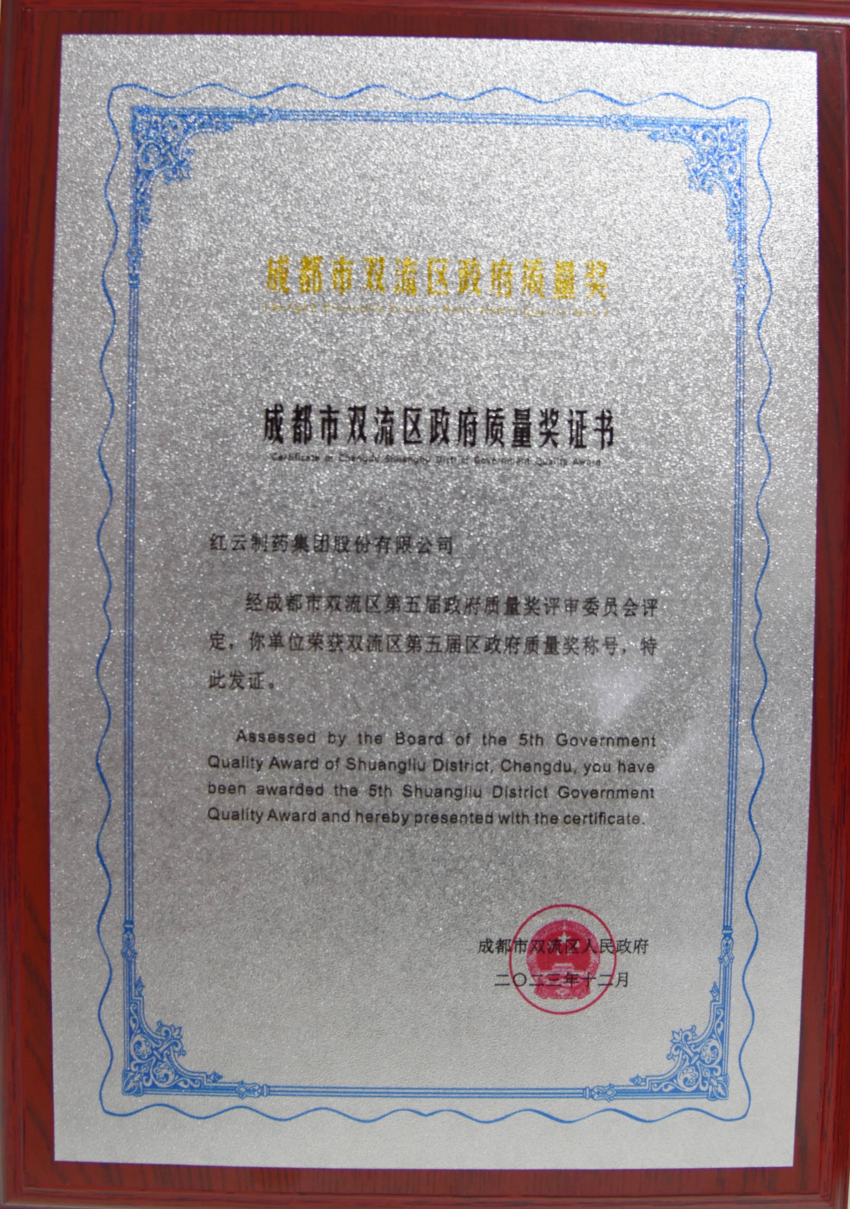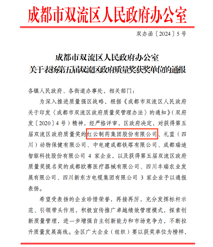 喜報(bào)|紅云制藥榮獲“第五屆雙流區(qū)政府質(zhì)量獎(jiǎng)”