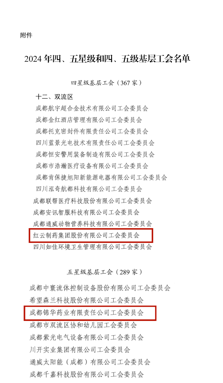在成都市總工會(huì)近期公布的關(guān)于2024年核定四、五星級(jí)基層工會(huì)名單通知中,紅云制藥集團(tuán)股份有限公司工會(huì)委員會(huì)和成都錦華藥業(yè)有限責(zé)任公司工會(huì)委員會(huì)分別榮獲“四星級(jí)工會(huì)”和“五星級(jí)工會(huì)”稱號(hào)。這一榮譽(yù)不僅是對(duì)公司工會(huì)工作的高度認(rèn)可,也是對(duì)我們?cè)诜?wù)職工、推動(dòng)企業(yè)文化建設(shè)、促進(jìn)企業(yè)和諧發(fā)展等方面所做努力的肯定。